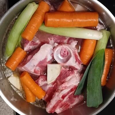 Wasser, Knochen, Suppengrün (Sellerie, Porree, Karotte), Butter